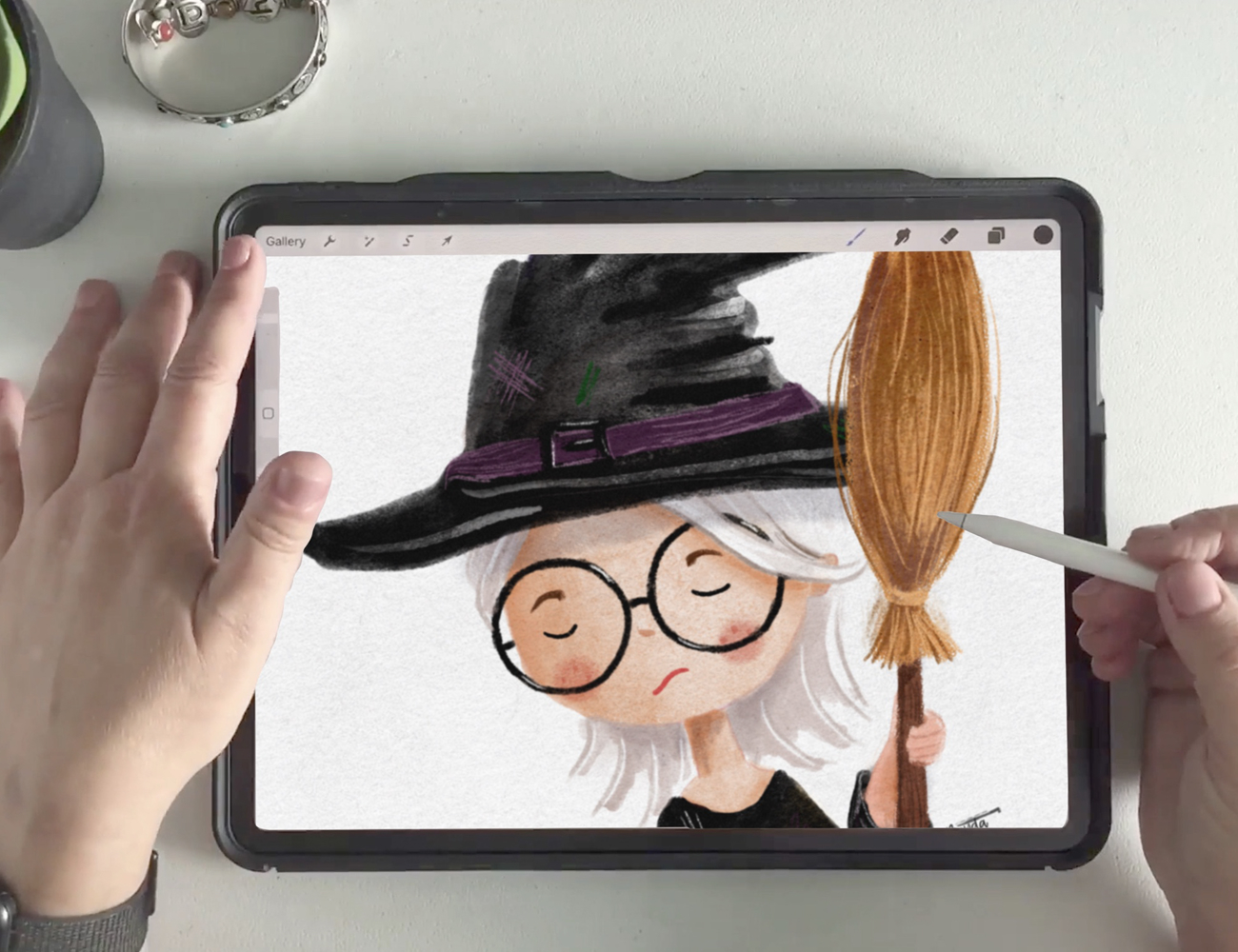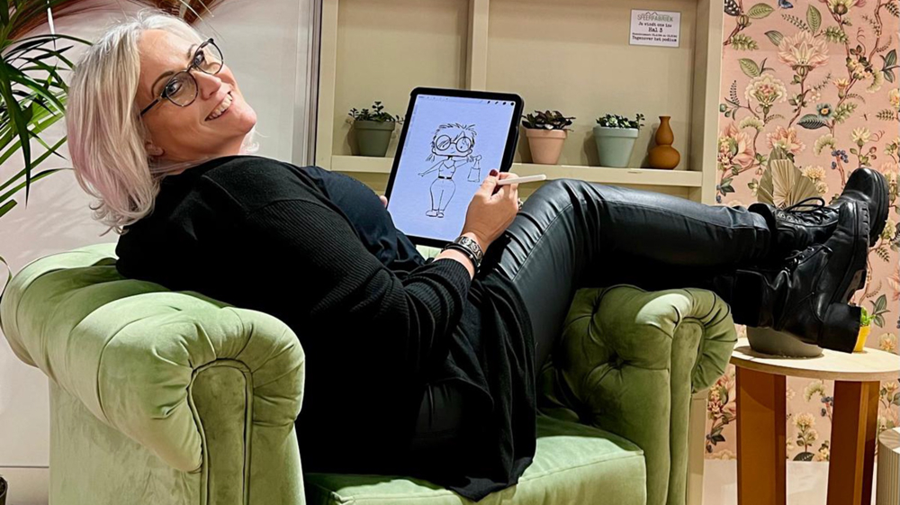 Brenda werkt op een iPad met een Apple pencil en de app Procreate. De app is een eenmalige aanschaf van maar 15.99 euro. Geen abonnement nodig en wanneer je deze eenmaal hebt, kan je gelijk aan de slag.