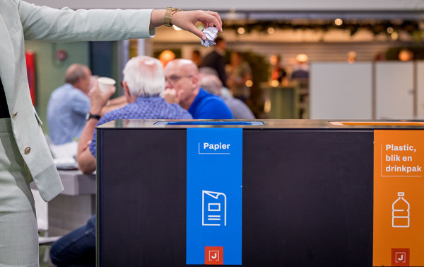 Binnen alle gebouwen van Jaarbeurs vind je gescheiden afvalbakken. Materialen als papier en plastic worden zo voor een groot deel hergebruikt. Dat bespaart nieuwe grondstoffen, energie en geld.