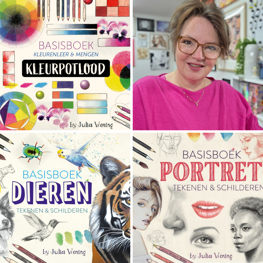 Tijdens het festival presenteer ik met trots mijn nieuwe boek “Basisboek Kleurenleer & Mengen Kleurpotloden”, vol praktische oefeningen, kleurencirkels en tips om zelf te experimenteren met kleur. Natuurlijk zijn ook mijn andere Basisboeken, zoals Dieren, Portret en Tekenen, aanwezig.