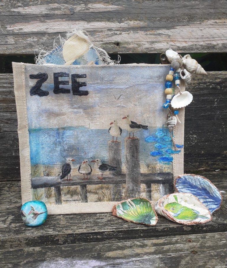 Heb je al eens een tas bij ons gemaakt? Je kunt bij ons ook een decoupage workshop volgen met een schelpen en een vaas.