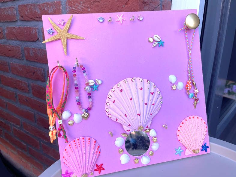 “Maak een super hip Sieradenbord met veel verschillende schelpen, haakjes en een spiegeltje.