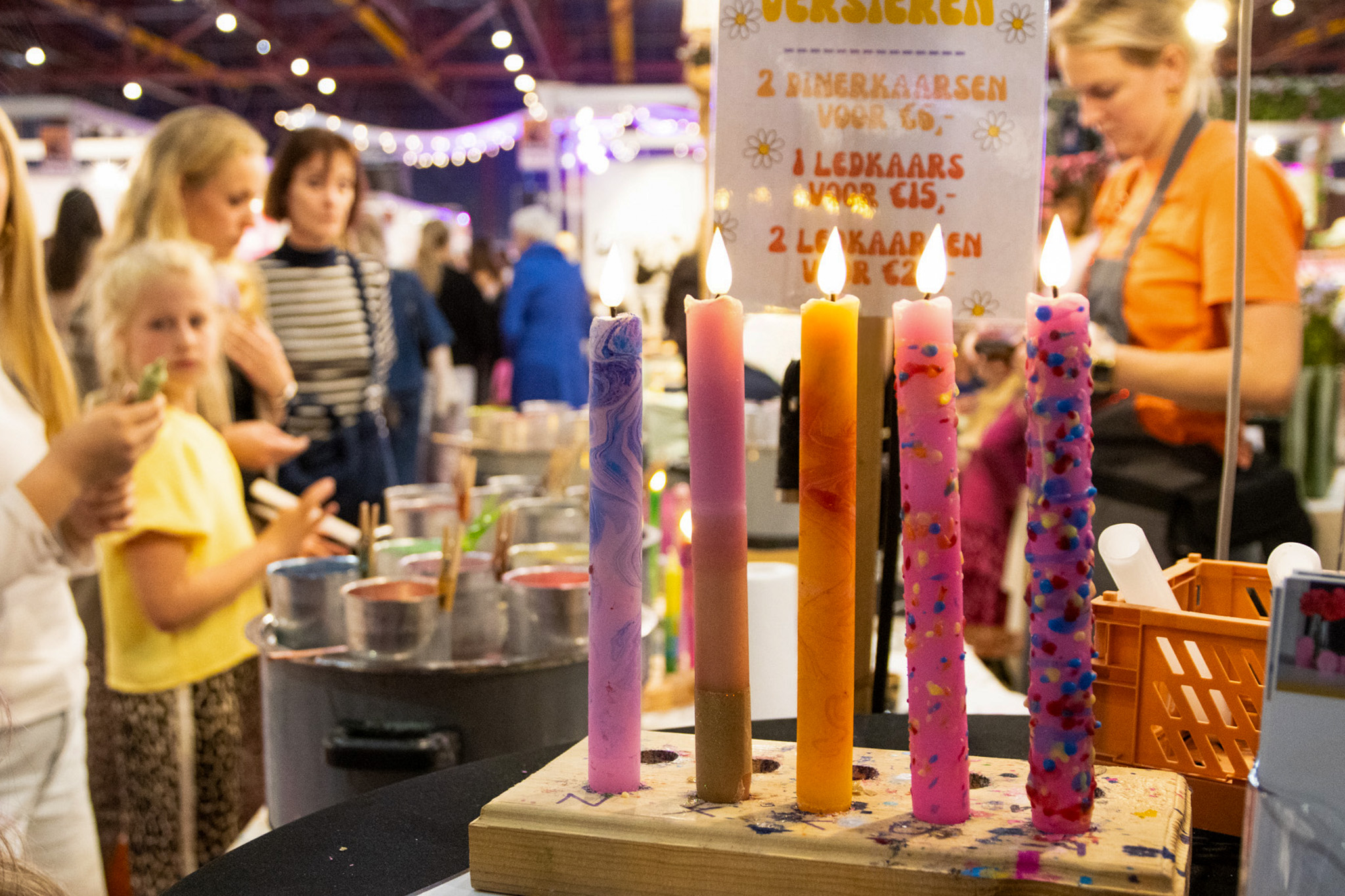 Ook dit jaar staan we op het Lentefestival! Dip 2 witte dinerkaarsen in vrolijke kleuren: fel of pastel, alles kan. In ±5 minuten maak je je eigen kaarsen — leuk voor jong en oud.